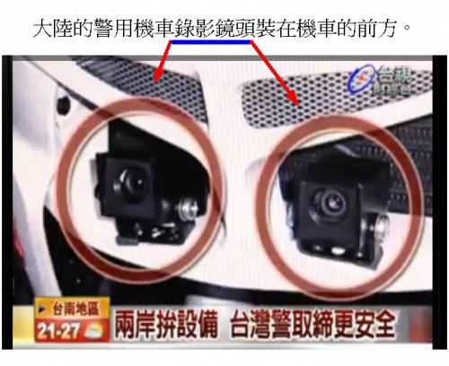 大陸交警(公安?)的警用機車錄影鏡頭在機車的前方。