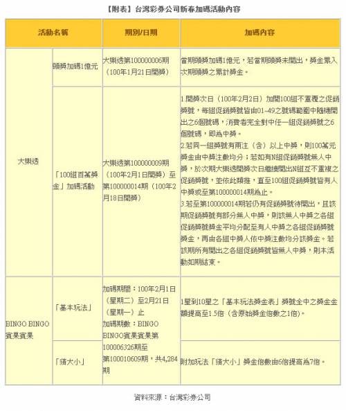 為迎接民國100年的農曆春節,台灣彩券公司今(18)日宣佈一系列春節加碼活動,首先於1月21日(週五)當期開獎的大樂透頭獎獎金加碼1億元,讓民眾提前迎財神;同時大樂透更史無前例推出「100組百萬獎金」加碼活動,在過年期間將多開100組促銷獎號,每組獎號可得100萬元獎金,合計加碼金額1億元,等於一注大樂透彩券將多出100個中100萬元的機會。至於5分鐘開獎一次的BINGO BINGO賓果賓果將自今(100)年2月1日至2月21日止一連21天獎金加碼,「基本玩法」獎號全中,獎金增加到1.5倍,而「猜大小」獎金自6倍增加為7倍。