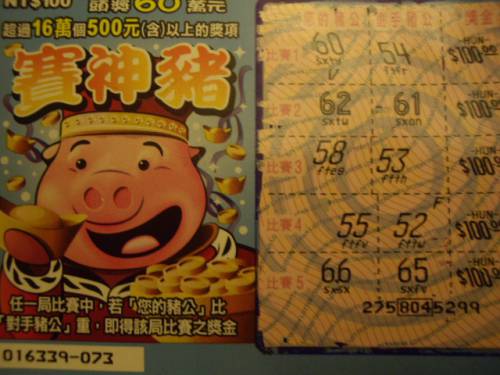 晚上跑出去連括了五張都沒中到了第六張賽神豬先刮開了獎金欄五個都是一百就知道中了 還好小賠一百而已~