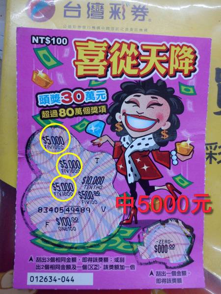 今天吃飽飯,顧店時有位客人一來就指定要44號,他刮出了 五仟元的彩金~~ 如圖