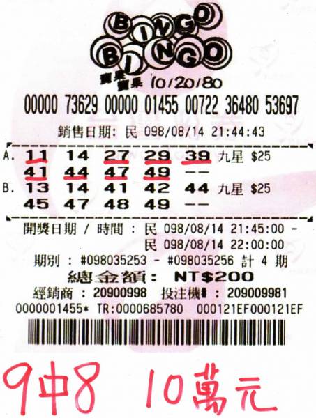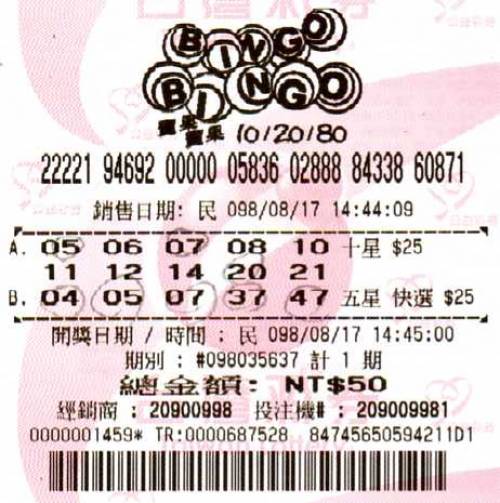 97年賓果6中6x20倍50萬元,大樂透12/5貳獎300萬元