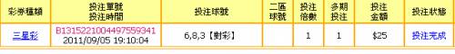 2011/09/04 03:11:53 5,5,1,3【組彩】 1 3 $75 投注完成 100000213 - - -