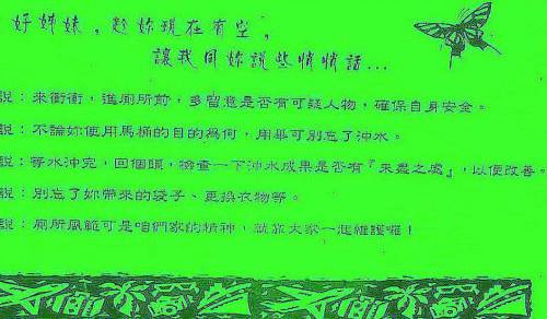 (4)說:來衝衝,進廁所前,多留意是否有可疑人物,確保自身安全。
