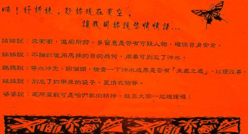 (1姑姑)說:來衝衝,進廁所前,多留意是否有可疑人物,確保自身安全。