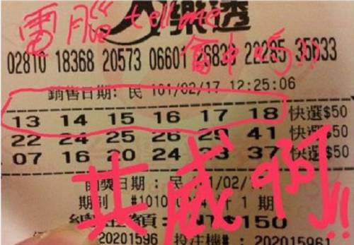一名男網友17日以電腦快選方式,買到了「13、14、15、16、17、18」這串連號,他哭笑不得地在彩券上寫:「電腦,你說這會中嗎?哩共威啊!」po文分享時還補上一句,「乾脆給我1、2、3、4、5、6好了啊!」